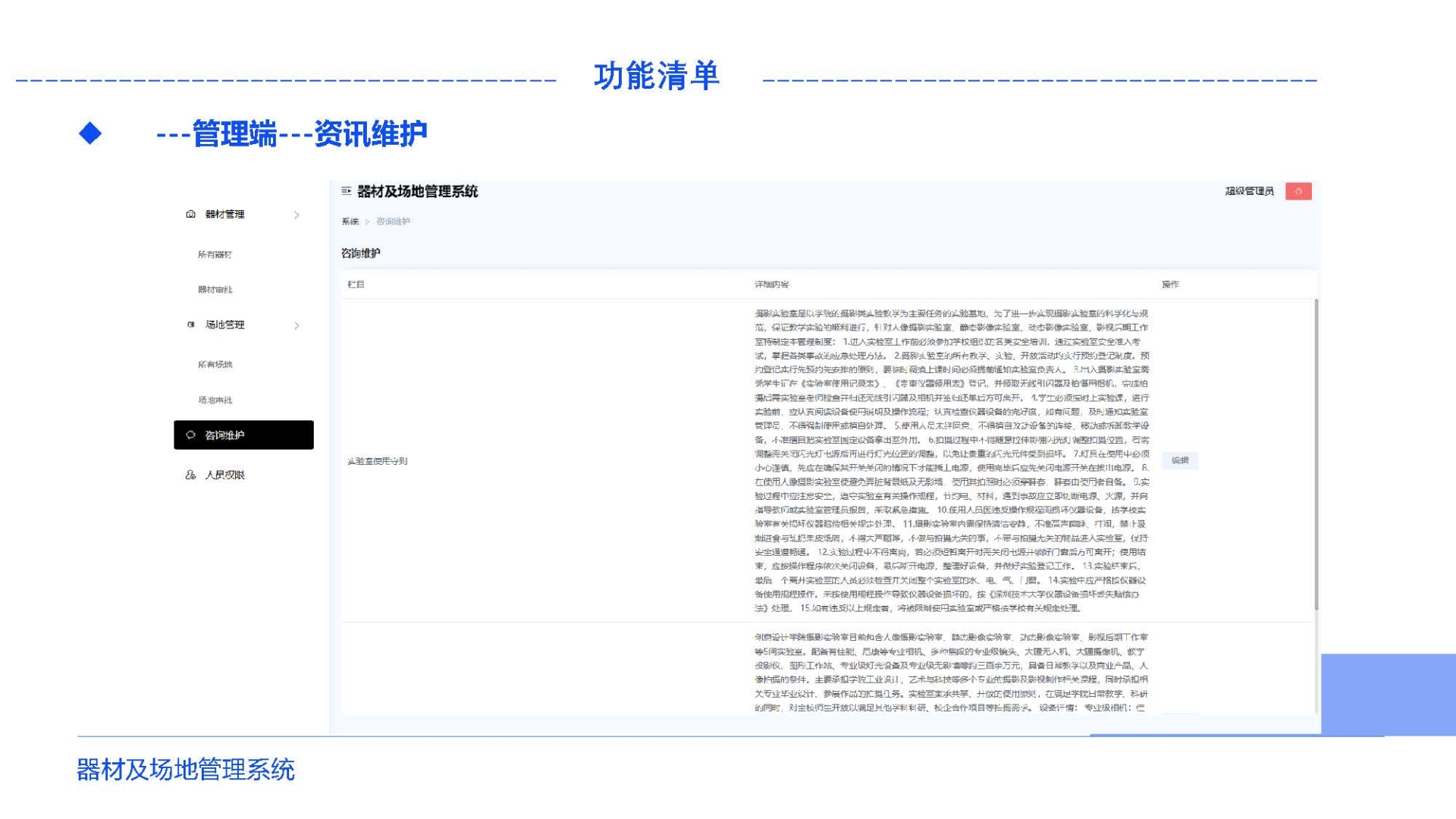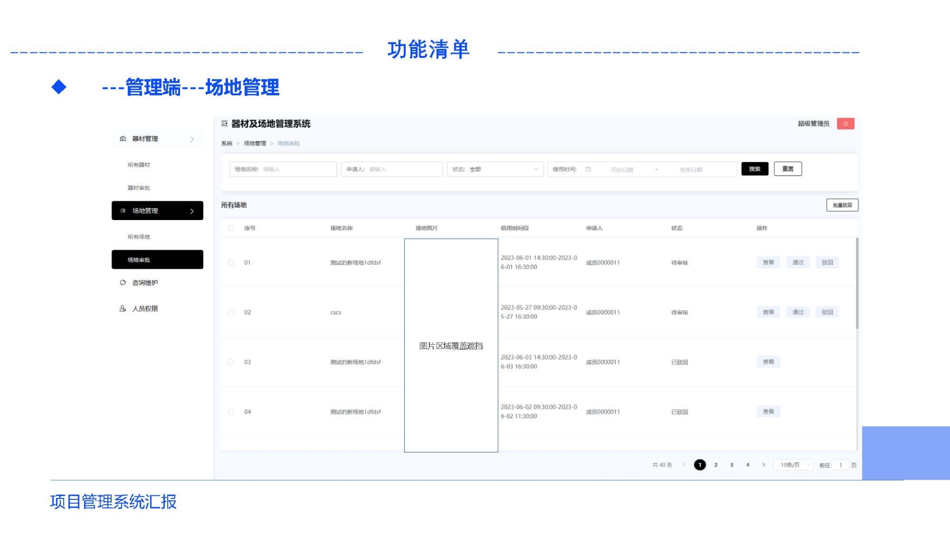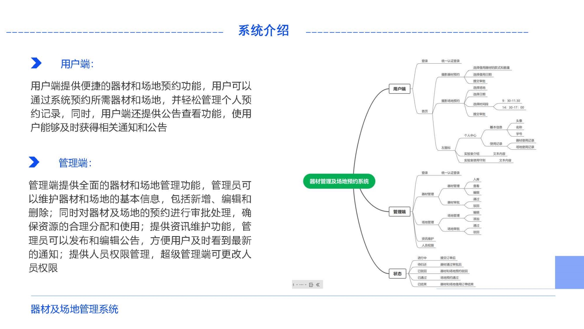此系统为方便管理员管理器材场地而定制,器材、场地的维护、预约、审批、记录、公告等均可在系统完成和体现.