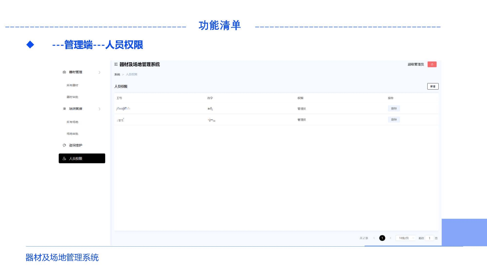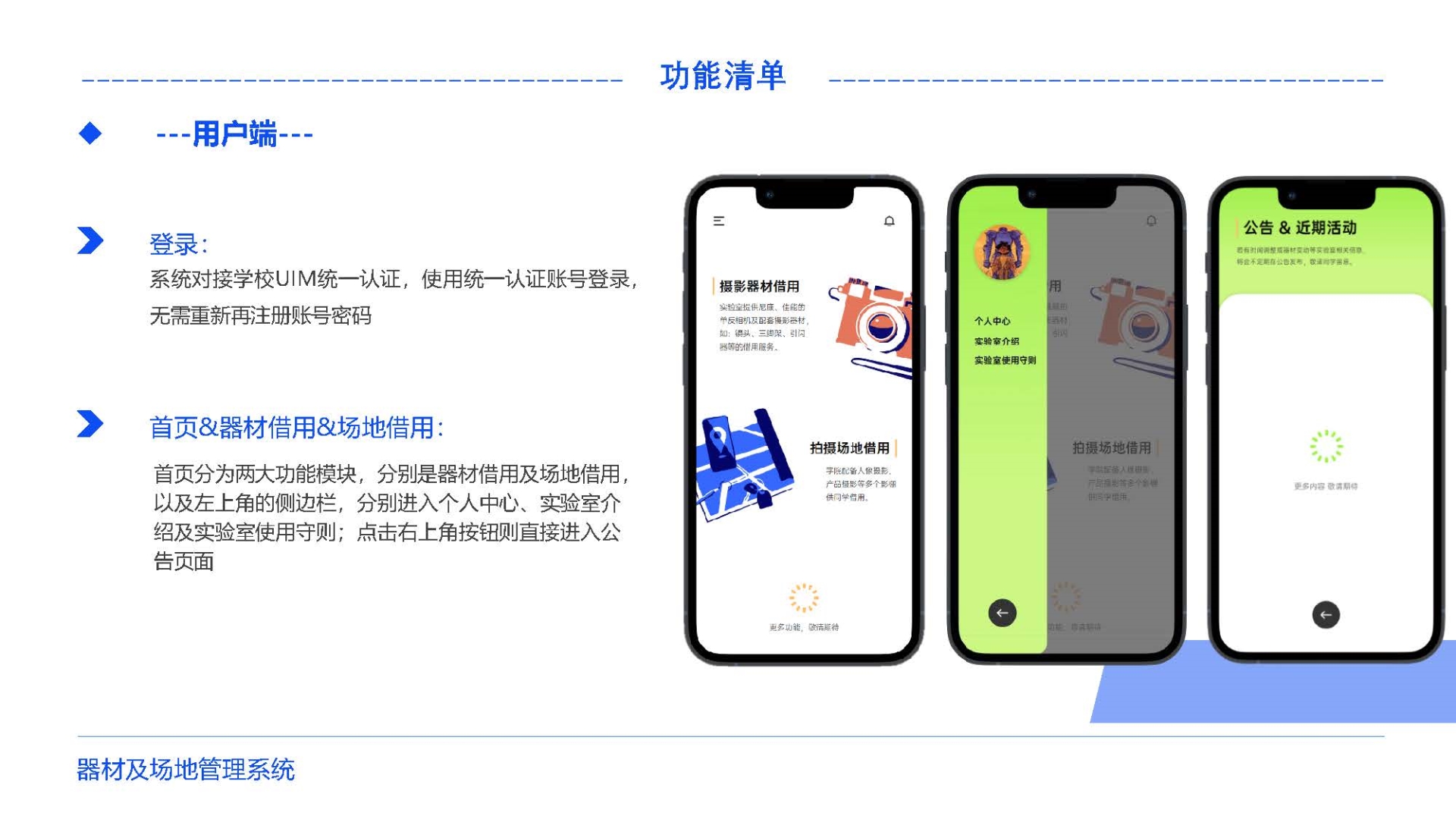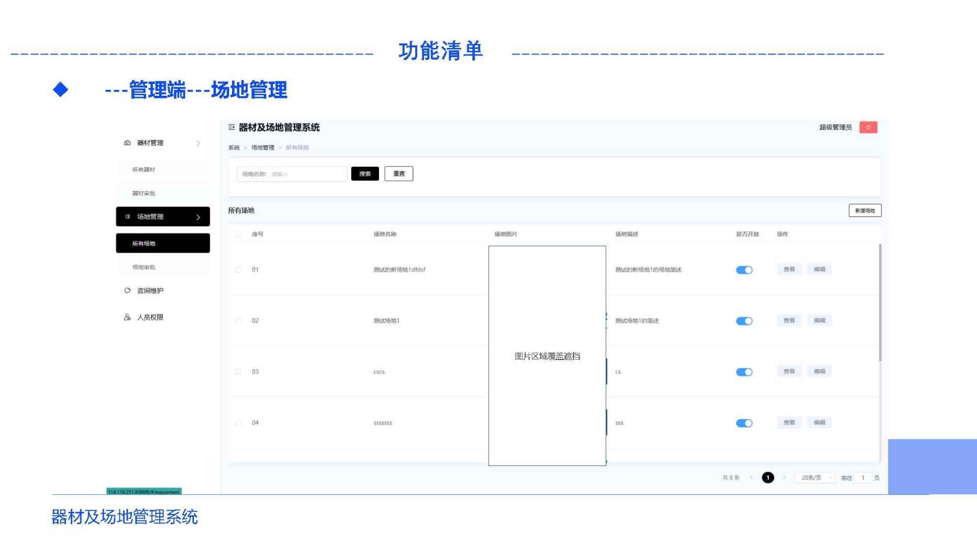 此系统为方便管理员管理器材场地而定制,器材、场地的维护、预约、审批、记录、公告等均可在系统完成和体现.